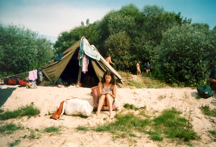 Abends schlagen wir am Flussufer unsere Zelte auf. Es sind einfache handgenähte Baumwollzelte mit Ästen als Zeltstangen. Die "Türen" werden lediglich zugeknotet, nachts ist es innen feucht und stockdunkel. Der dünne Stoff hält die Kälte und den Tau kaum ab. Von oben tropft es beständig auf meinen Schlafsack. Es ist Kondenzwasser, denn wir teilen uns das enge Zelt zu viert. Für unseren Müll wird eine Grube ausgehoben. Toiletten oder Duschen gibt es nicht, ebenso wie befestigte Campingplätze. Wir waschen uns, unsere Kleider und unser Geschirr in den schlammigen Fluten der Desna. Trockene Haut und ein leicht erdiger Geschmack auf den Lippen sind die Folge. Das Kochen ist besonders schwierig. Wir haben keinen Spiritus- oder Benzinkocher, sondern kochen in einem großen Blecheimer über dem offenen Feuer. Meist gibt es Suppen aus Kartoffeln und Kohl, Getreidebrei mit Dosenfleisch und Gemüse oder verkochte Nudeln mit Tomaten-Knoblauch-Soße. Manchmal ist das ganze angereichert von kleinen, mickrigen Fischlein, die wir unterwegs gefangen haben. Es dauert Stunden, bis das Essen fertig ist, zumal wir keine modernen Hilfsmittel wie z.B. Brühwürfel und Soßenmischungen haben. Aber das frische Obst und Gemüse der Ukraine ist ein Genuss. Es schmeckt einfach unbeschreiblich gut!